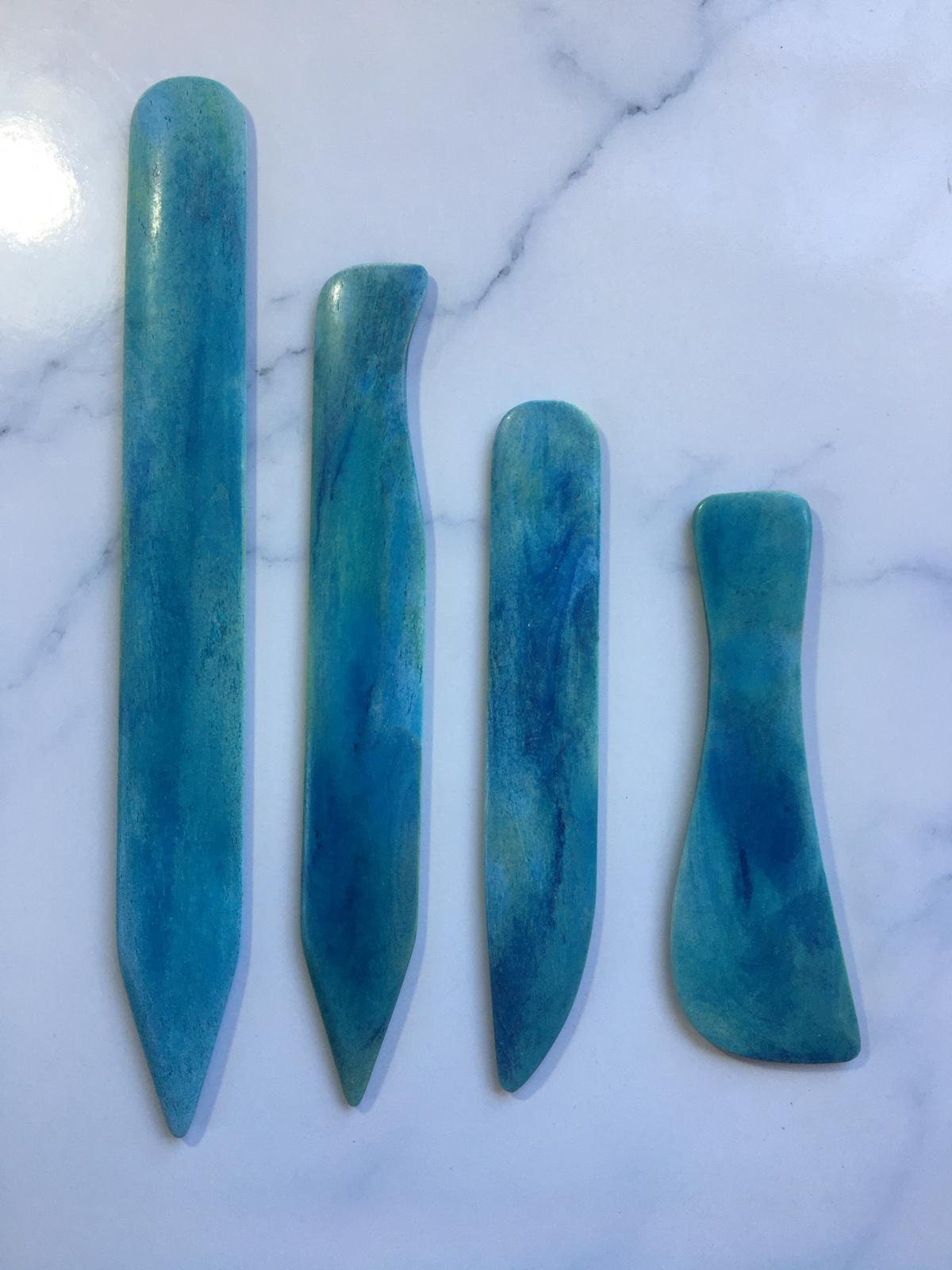 The bone folders come in natural original colors. For the coloured bone folder - the bone has been treated to ensure the colour will stay and not come off.